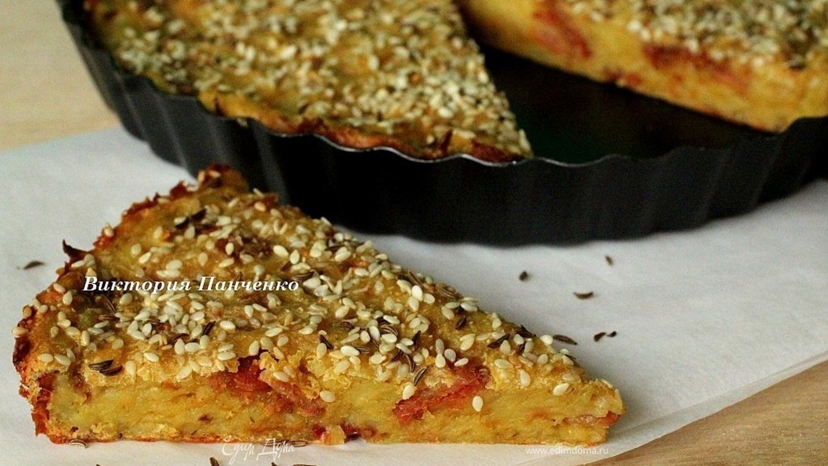 Выложить картофельную массу в форму и хорошо разровнять. По желанию посыпать кунжутом и тмином... - Шаг 7