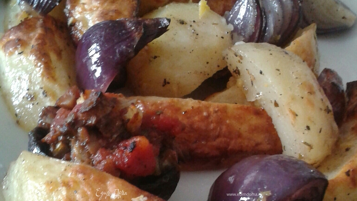 Картофель, запеченный с красным луком и фаршированными грибами