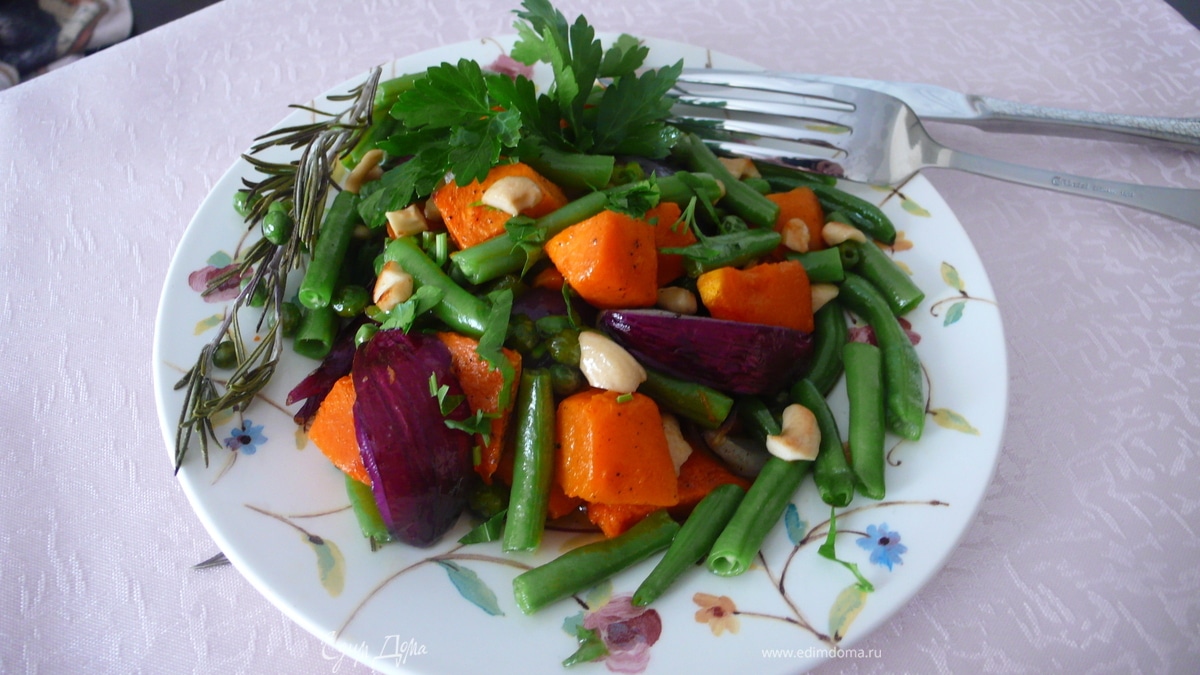 Теплый салат из тыквы с красным луком и фасолью