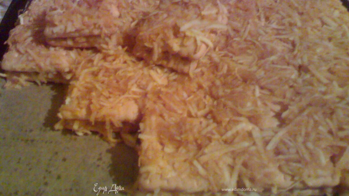 Включаем духовку на 180 градусов, застилаем противень промасленной пергаментной бумагой и выкладываем первый слой печенья. - Шаг 3