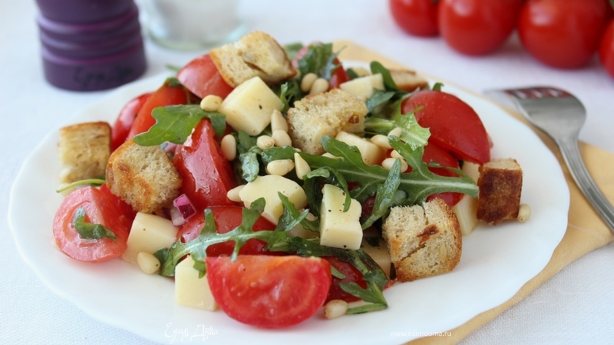 Салат из помидоров с руколой, фетой и сухариками