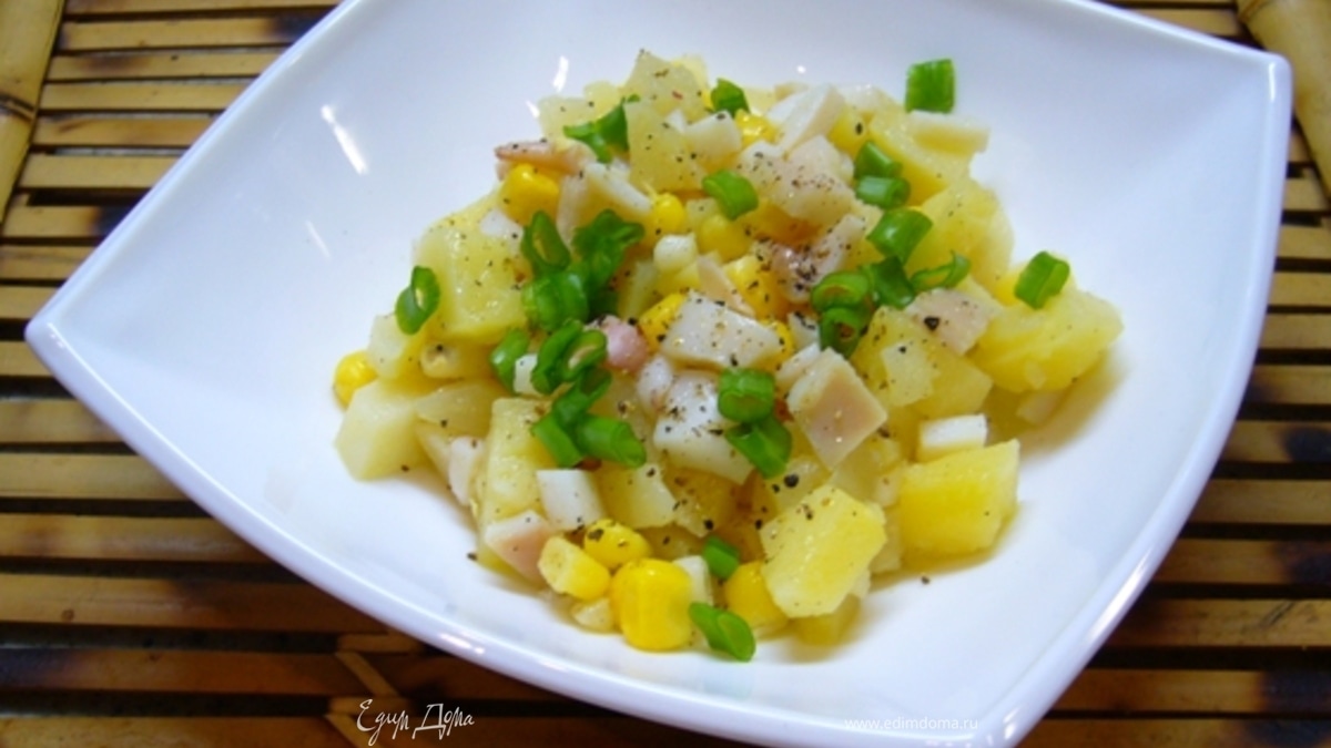 Собираем салат: картофель режем кубиками, кальмары измельчаем. Сливаем воду из чашки с луком. Избавляем от воды кукурузу. Солим-перчим салат. Смазываем оливковым маслом. Перемешиваем. При подаче посыпаем порезанным зеленым луком.