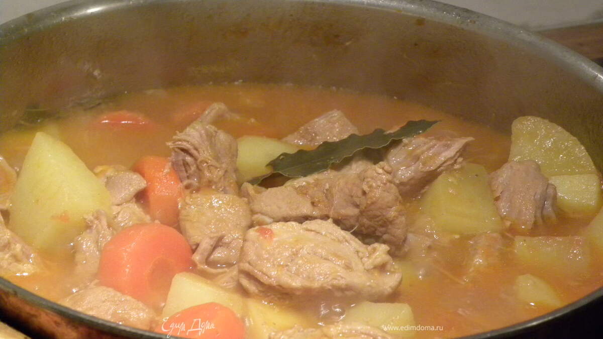 - Шаг 1В глубокой сковороде на сливочном масле обжарить целые зубчики чеснока и порезанную кубиками свинину. Добавить вино, лавровый лист, перец, соль (или кубик бульона). Выпарить вино. Добавить крупно нарезанные лук и морковь, томатную пасту. Всё тут же залить горячей водой, закрыть крышкой. Тушить 1,5 часа на медленном огне, время от времени помешивая и доливая воду. Свинина должна стать очень мягкой. За 20 мин. до окончания приготовления добавить нарезанную кубиками картошку.