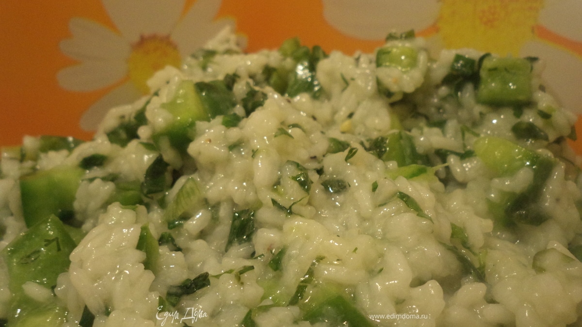 Добавить к рису зеленый перец и зеленый лук, перемешать. Поставить на слабый огонь и варить, периодически помешивая, пока жидкость полностью не впитается, около 5 минут. Рис должен получиться плотным и рассыпчатым, а овощи остаться хрустящими. - Шаг 3
