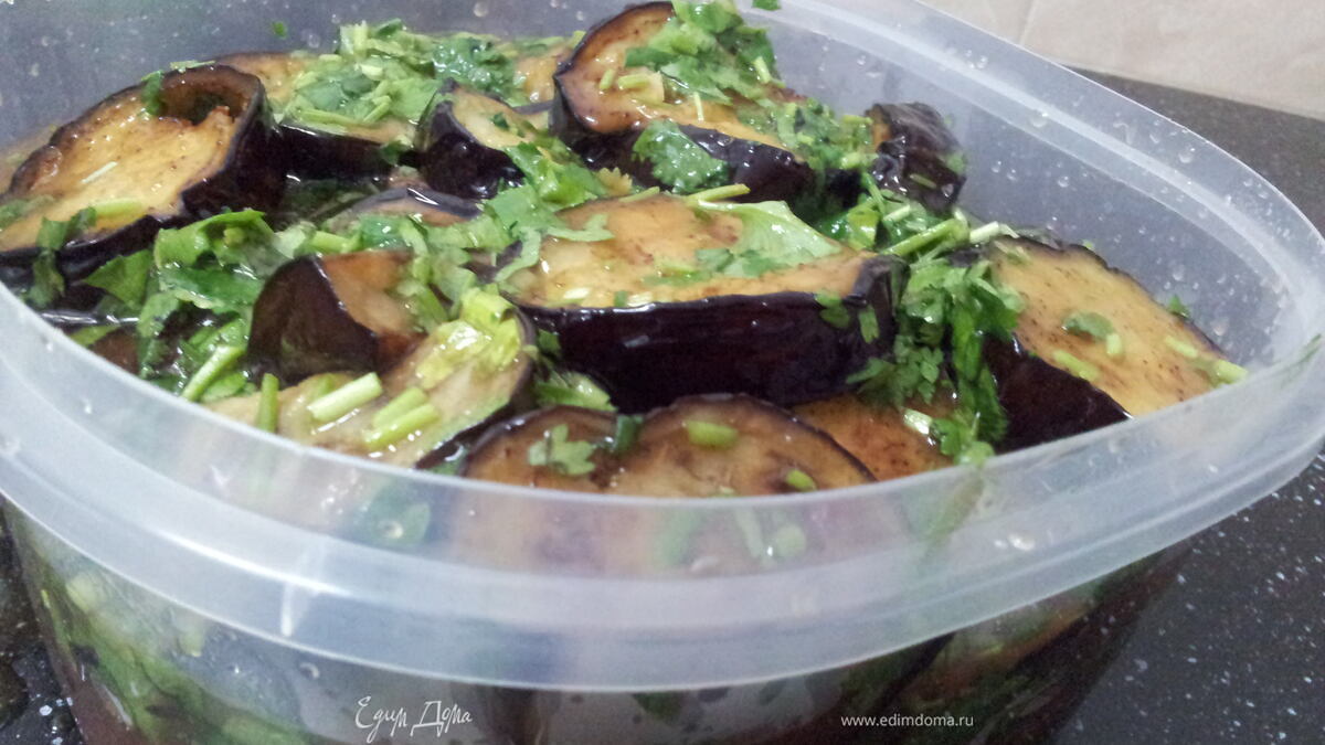 Окунаем каждую половинку баклажана, чтобы кинза окутала баклажан равномерно. Почему каждую половинку отдельно и не перемешиваем сразу? Потому что жареный баклажан мягкий, и если перемешать, то может все развалиться и потеряется вид. Складываем в пустую емкость. Далее оставшийся маринад выливаем сверху. - Шаг 5