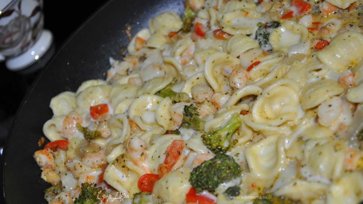 - Шаг 1Сварить пасту Orecchiette согласно инструкции на упаковке. Варится примерно 12 - 15 мин. Варить лучше одновременно с приготовлением овощей и морепродуктов. Можно заменить на любую пасту, можно ракушки. Воду слить.