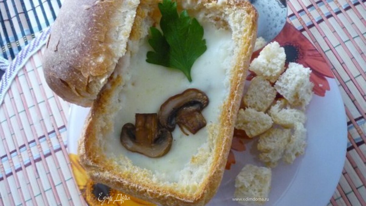 - Шаг 2Хлеб покупной: срезаем макушку, вынимаем мякиш и ставим в духовку минут на 20, что бы хлеб затвердел. Потом наливаем туда суп, закрываем крышкой из хлеба и ставим в духовку минут на 5-10.