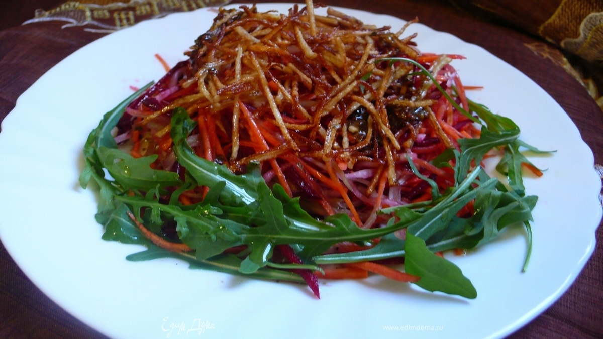 Свеклу, сельдерей, яблоко и морковь смешать, сверху выложить жареный картофель полить заправкой. Украсить руколой.