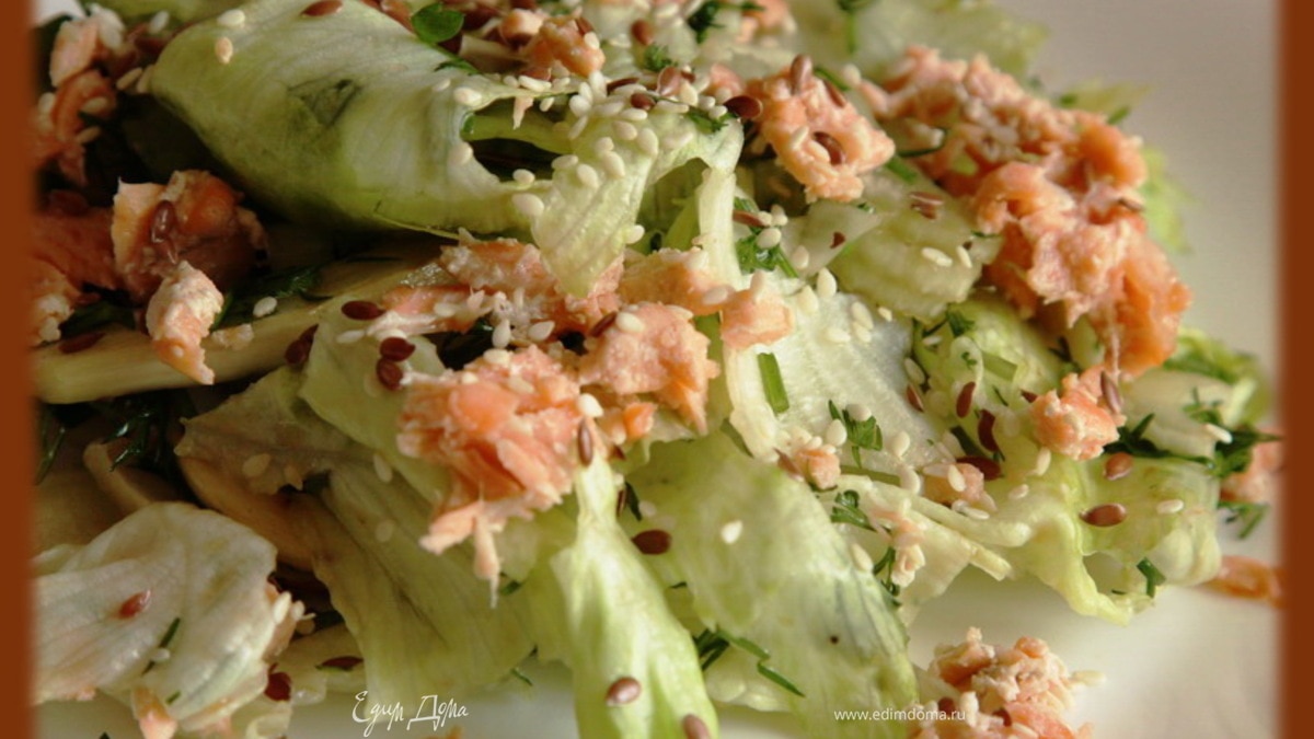 Выкладываем на порционные тарелки, добавляем кусочки красной рыбы, посыпаем кунжутом и семенами льна. Приятного аппетита!