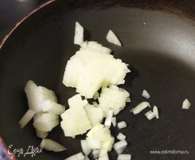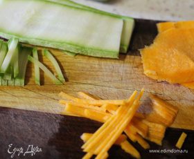 Половину кабачка режем слайсами, а потом соломкой. С тыквой поступаем также. Добавляем все это к луку и жарим до слегка золотистого цвета.