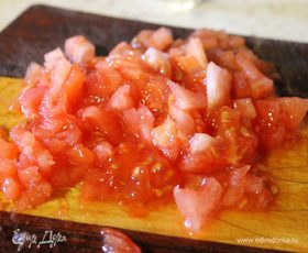 С помидора снять кожицу, нарезать мелким кубиком и добавить к зажарке. Тушить все вместе 5 минут, в конце добавить томатную пасту.
