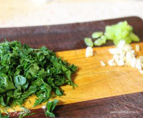 В конце варки добавить мелко рубленную зелень, перец и чеснок.