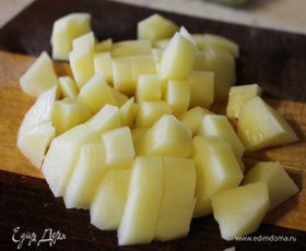 Картофель режем кубиком и кладем в бульон. Варим картофель 15 минут, потом добавляем рис.