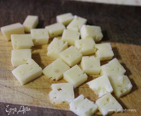 Один ломтик сыра нарезать на полоски, а потом на кубики.