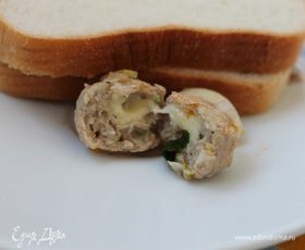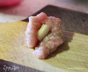 Берем небольшое количество фарша, примерно с грецкий орех. Слегка расплющиваем его на ладошке, в середину кладем два кубика сыра и аккуратно его прячем в фарше. У меня получилось 8 таких фрикаделек.