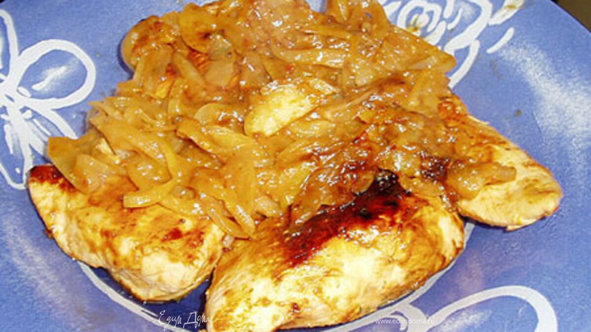 - Шаг 1Смешать соевый соус, кетчуп, мед, горчицу, раздавленный чеснок, порезать грудки на 3/4 куска, замариновать (от 2х часов до 2х дней). Вынуть курицу, замариновать лук полукольцами (можно и без лука). Хорошо разогреть сковородку, обжарить курицу по 5 мин с каждой стороны. Пожарить лук с оставшимся маринадом до теx пор пока жидкость не выпарится. Выложить на курицу.