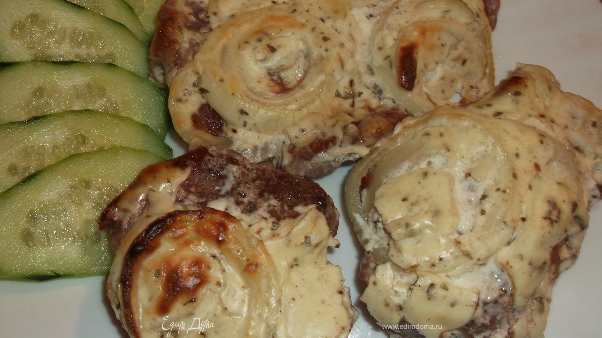 Мясо немного солим (не забывайте соус солёный), перчим, выкладываем лук, порезанный тонкими кольцами (можно пофантазировать добавить порезанное яблочко или ананас).