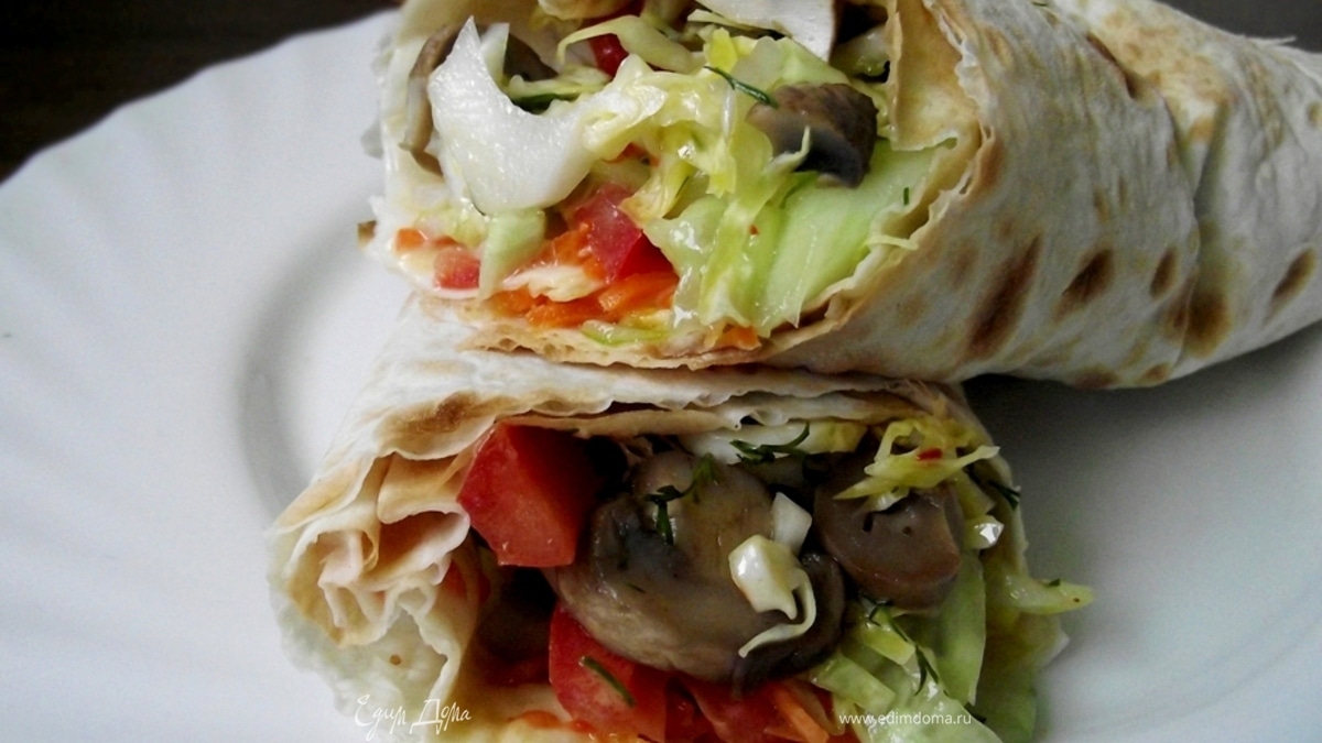 Лаваш с грибами и овощами. Нарезаем овощи соломкой, шампиньоны тонкими ломтиками.Травку промыть и просушить. Шампиньоны несколько минут обжарить на большом огне. Лаваш разрезаем на 4 части. Сбрызнуть оливковым или растительным маслом, выложить овощи слоями, добавить грибы, соль и перец по вкусу, травку, а в конце несколько капель масла и сока лимона. Завернуть плотно в рулет и поставить в форму. - Шаг 2