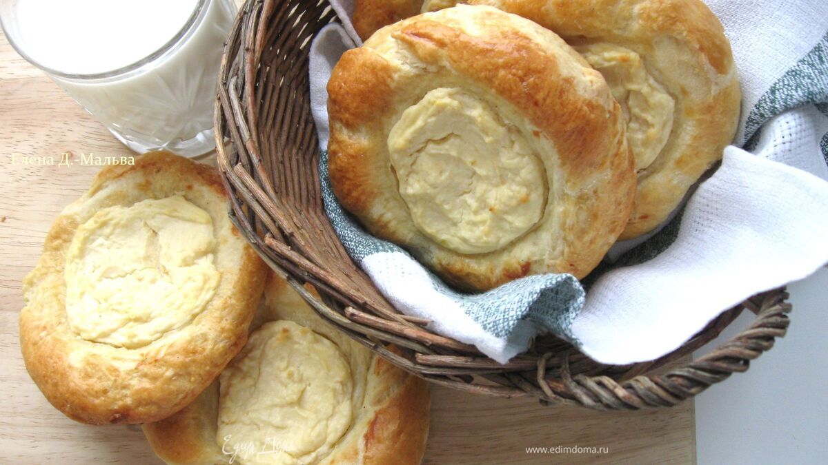 Готовые ватрушки сбрызнуть водой и положить под полотенце. Очень вкусно к горячим ватрушкам подать стакан прохладного молока. Приятного аппетита!