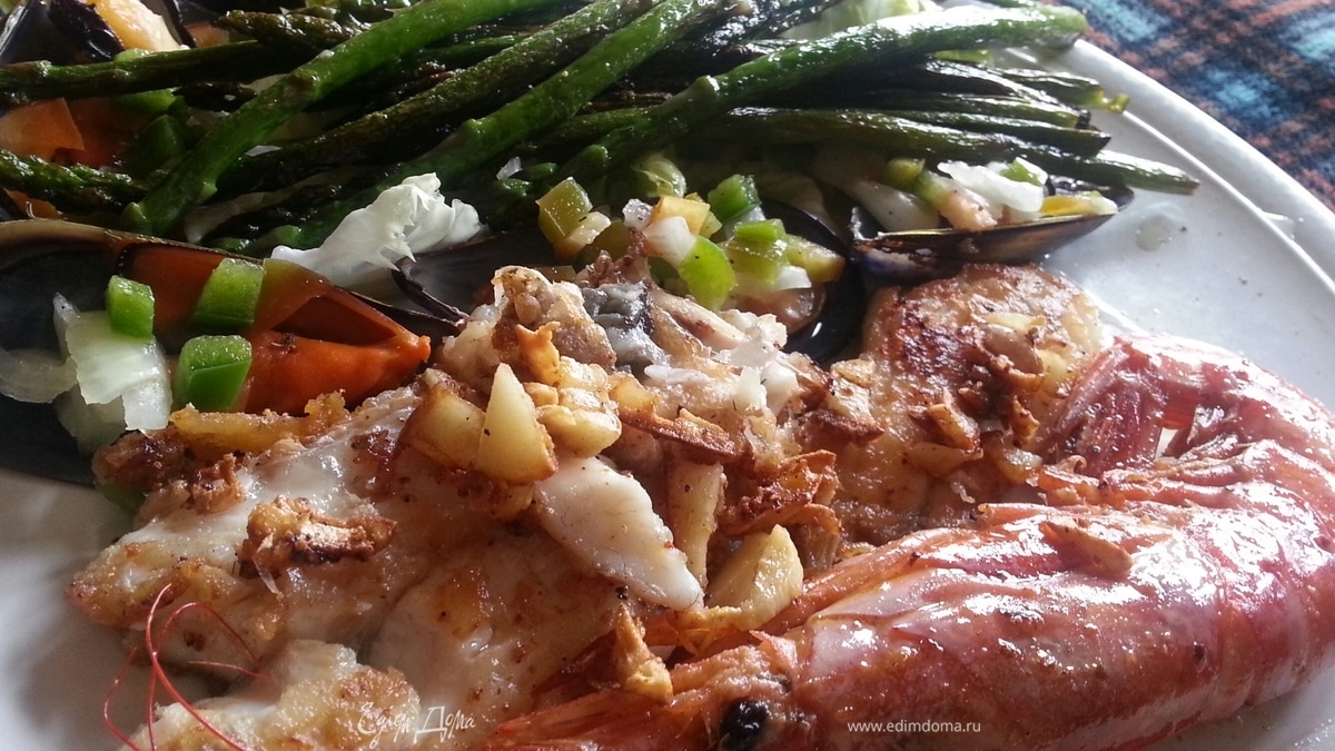 - Шаг 2Филе рыбы солим, перчик и добавляем сухой чеснок. На горячую сковороду наливаем масло и поджариваем филе с двух сторон, также креветку поджарить. В конце добавить табаско. Мелко порезанный чеснок также добавляем в конце. Зелёную спаржу поджарить на оливковом масле. Жарить её недолго 5 мин.