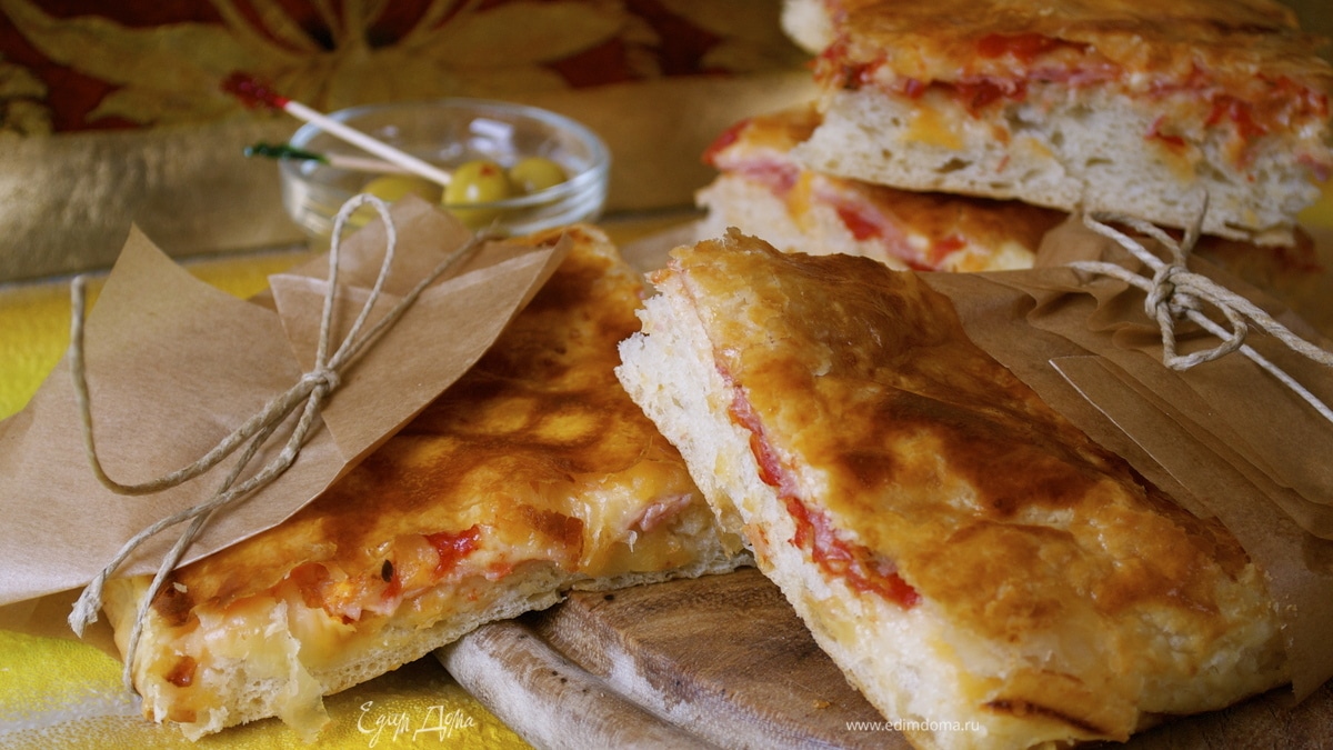 Приготовить и замесить тесто как для пиццы. Следуя указанным ингредиентам, я замесила тесто в хлебопечке (на этот раз), но можно это прекрасно сделать и вручную. Смешать все ингредиенты, замесить тесто, сформировать в шар и положить в большую миску на подъем на 2 часа (миску накрыть пленкой). Можно использовать и сухие дрожжи - 4 г. - Шаг 1