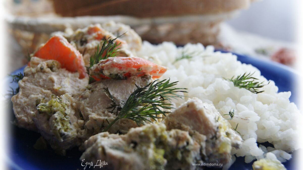 Вернуть курицу с овощами в мультиварку, добавить зелень, готовить пару минут. Подавать с рисом, или другим гарниром. - Шаг 6