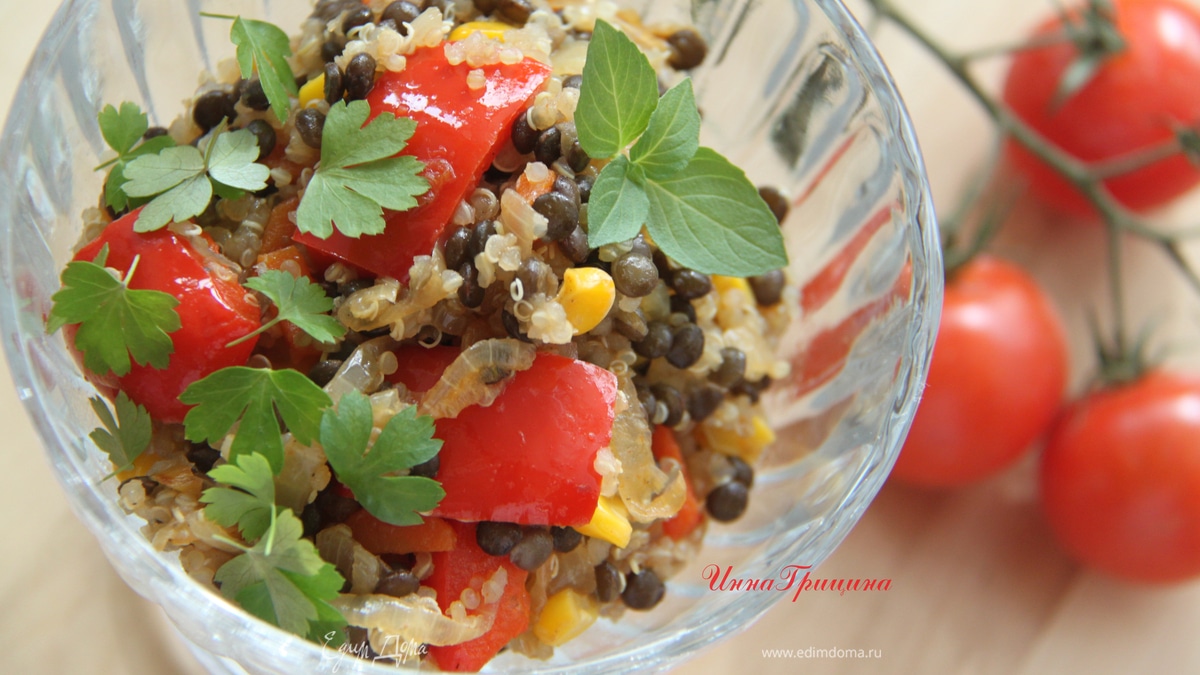 Тeплый салат с черной чечевицей и киноа