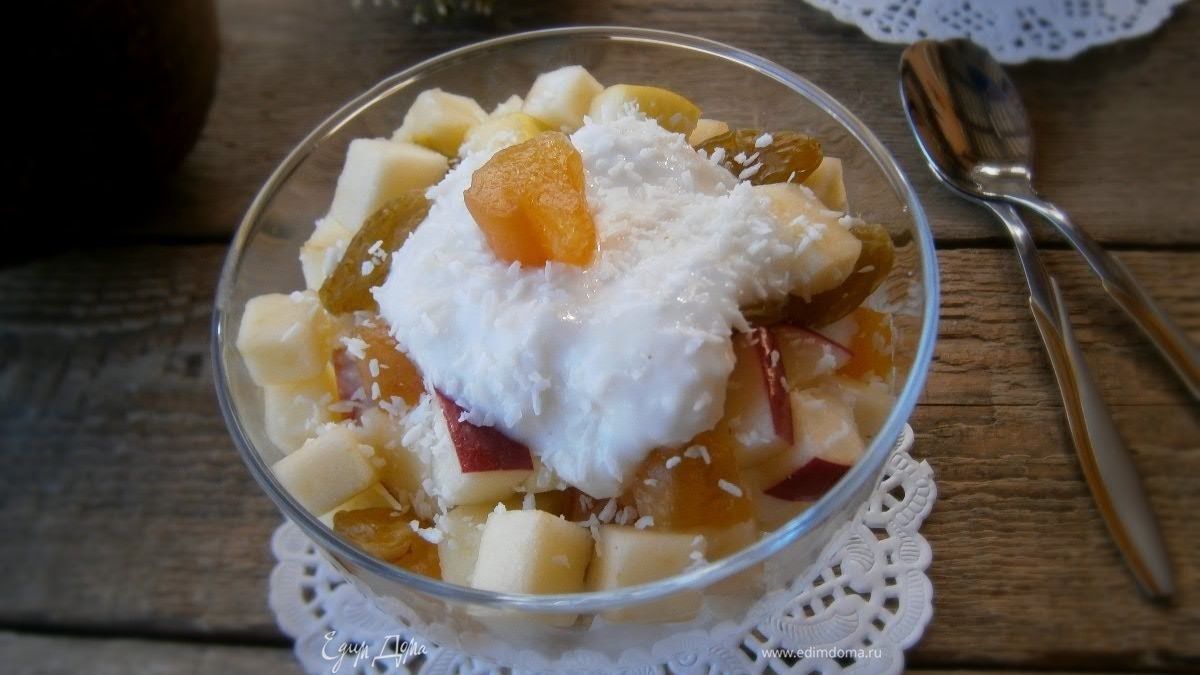Яблочный салат с изюмом, персиком и кокосовым йогуртом