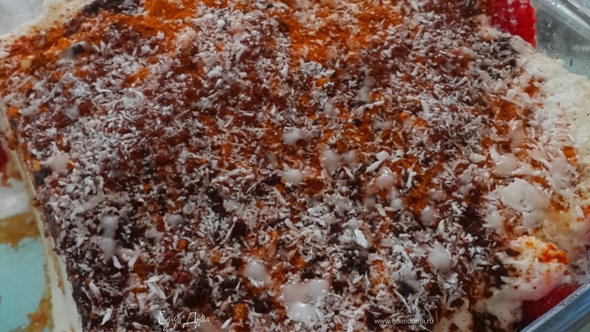 И вот ставим торг в холодильник на час. И вуаля торг готов. Посыпаем кокосовой стружкой, корицей или какао или украшаем клубникой...... как ваша фантазия подсказывает. Ха на фото пол торга нет.... подружка на чай заходила.......