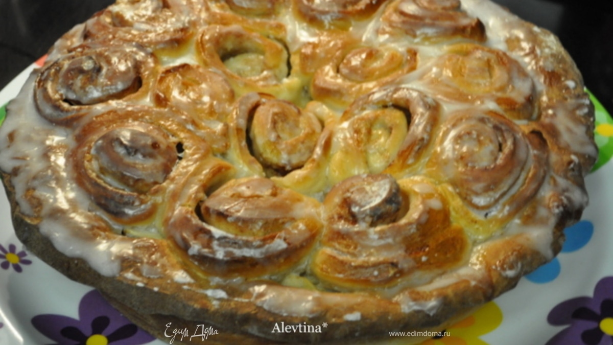 Сверху порезанный рулет с корицей. Смажем яйцом. Поставим в духовку разогретую на 200 гр. на 50 мин. Чтоб не пригорела прикроем фольгой. Готовый пирог достанем из духовки. Дадим постоять, достанем из формы. - Шаг 7