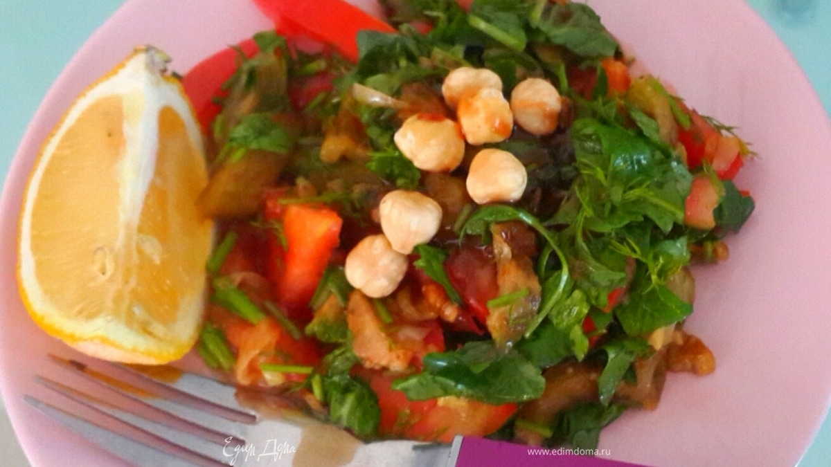 Готовый салат поливают гранатовым соусом или сиропом, сбрызгивают лимонным соком. МАСЛО НЕ ДОБАВЛЯТЬ!!!! (баклажаны и лук впитали масло сколько нужно). Для украшения фундук и зелень. Салат хорошо гармонирует с шашлыком, красным вином. Салат, как и Кавказ, пряный, острый, но со сладким окончанием.