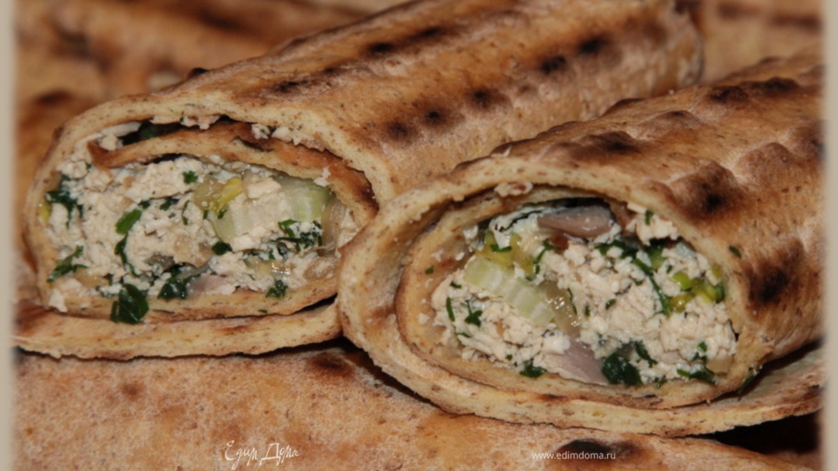 Лепешки отдохнули и стали мягкими. Выкладываем начинку с одного края лепешки и сворачиваем плотно рулет. - Шаг 13