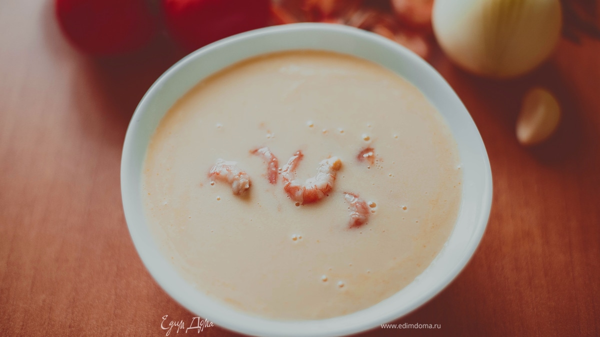 Итак в подготовленный куриный бульон отправляем нарезанную картофель, солим и варим до готовности. В это время обжариваем лук с морковью 3-5 мин, не допускайте зажаривания, всё должно стать чуть мягче. Когда свариться картофель, добавляем туда обжарку , снимаем на время с огня и отправляем в блендер . Затем опять ставим на огонь и добавляем сыр равномерно помешивая до полного растворения. Затем , отправляем заранее отваренные и очищенные креветки (со специями , травами и солью)