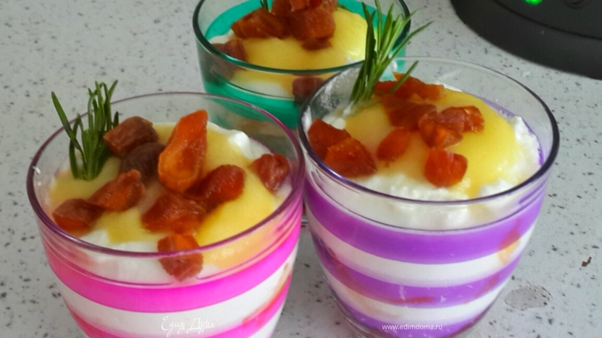Курагу режим на кусочки. Если курага очень сухая то залейте кипятком и оставьте на 5 мин. Выложите кусочки на пюре из яблока и украсьте веточкой розмарина. Поставьте охладиться на 10 мин в холодильник. Приятного аппетита!!! - Шаг 7