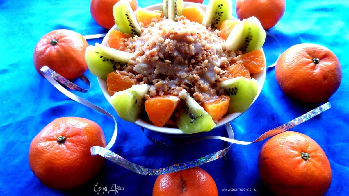 Фруктовый салат с овсяной крошкой и сгущенкой