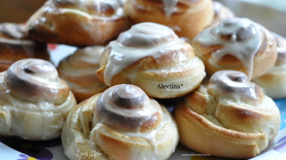 Разогреем духовку на 190 гр. Выпекаем 15-20 мин. Я прикрывала сверху фольгой . Достанем булочки из духовки. Покроем глазурью. Дадим постоять немного. Подаем к столу. Не оторваться!!! Я пекла в благодарность нашим соседям, которые помогли нам в период мой послеоперационный. Просили еще)))