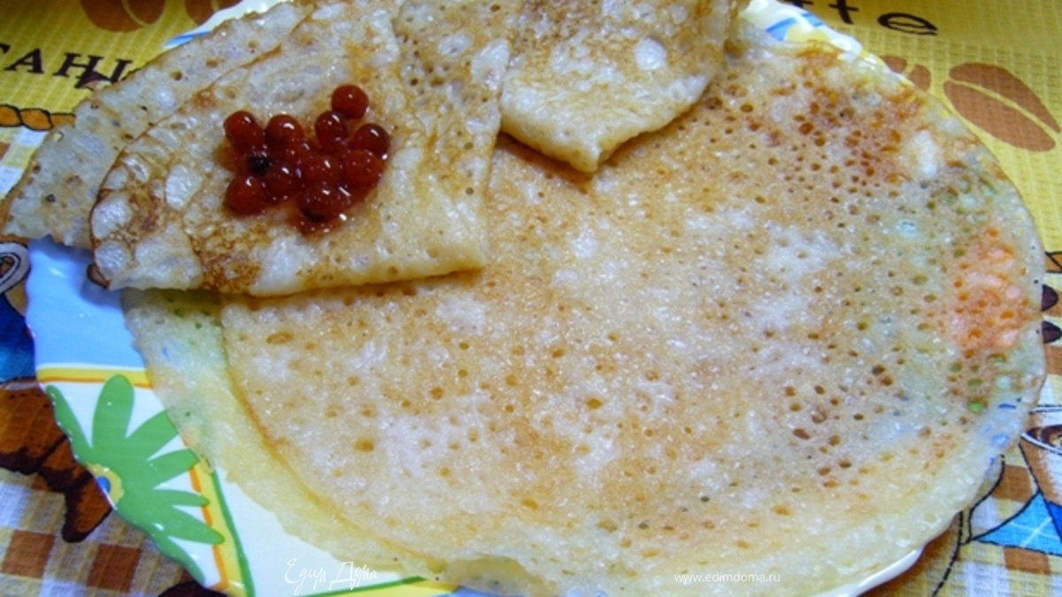 Рецепт — от Максима Сырникова. Он пишет, что народ устраивал в первую постную субботу тужилки по Масленице. Пекли блины из простого постного дрожжевого теста на воде. В данном рецепте предлагается вместо дрожжей, соды, разрыхлителя использовать сильно газированную воду. Блинчики получаются тонкими, кружевными, а по краям — хрустящая корочка. А подавала я их с вареньем из красной рябины.