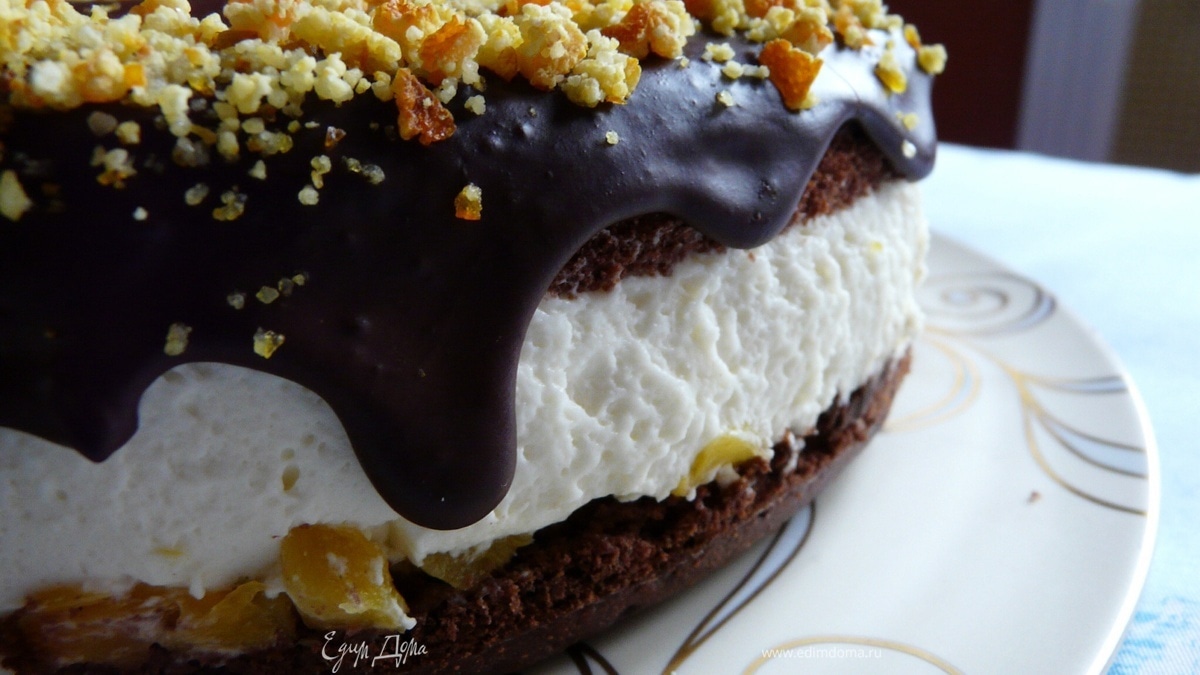 Я воспользовались уже знакомым мне и вам бисквитом на красном вине от Ирины ссылка на рецепт От себя в рецепт я внесла лишь незначительные изменения: еще немного уменьшила количество сахара, не отливала жидкую основу на ганаш, а использовала весь объем, не увеличивая при этом количество муки и взяла форму по-больше, 26 см. Готовый корж я разрезала пополам. Из одной половинки сделала основу, которую пропитала разведенной в воде сгущенкой.