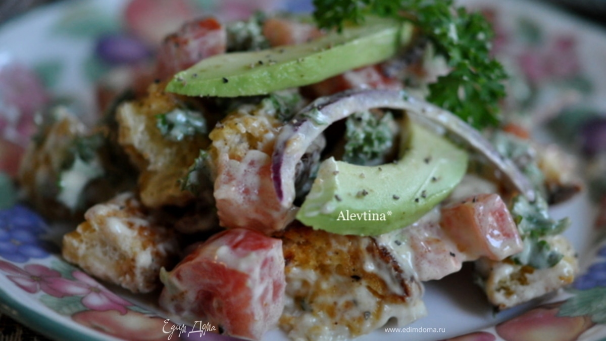 Смешать сухарики с зеленью с 1 го шага. Добавить порезанные овощи и очищенный и порезанный авокадо, перемешать. - Шаг 4
