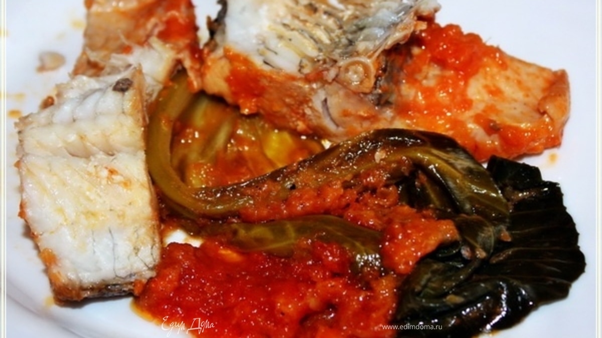 Вот. Приготовили подливу – заливку, или как может быть «соус»? Да ладно. Приготовили и в сторонку пока отставили. А я пока рыбкины кусочки в капустные листья заверну. Сразу замечу, что верхние листья, которые на картинке лучше было тоже Веснушке отдать. А я, понимаете, погнался за цветовой гаммой. Они не сильно вкусные. Те что белые не в пример нежнее и вкуснее. Каждый кусочек рыбки слегка присолить надо. Во-первых, чтобы соус не пересаливать (его ж потом съесть интересно будет), а во-вторых, рыбкины кусочки не будет разваливаться. - Шаг 18