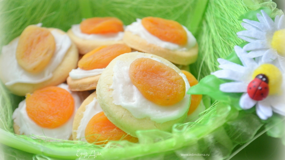 На печенье наносим глазурь, а сверху кладем одну курагу, которую я заранее залила кипятком и дала ей распарится. Потом обсушила и только тогда выкладывала на печеньку. )