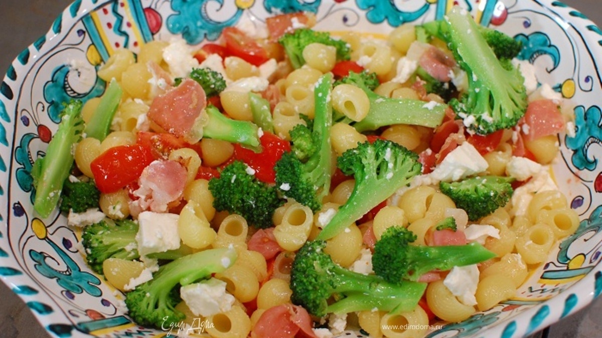 Салат из макарон с брокколи, фетой и беконом
