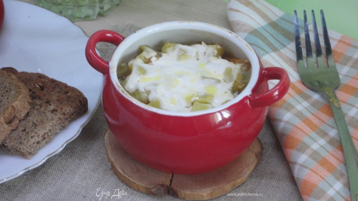 Ушное достать из духовки, снять крышки, добавить сметану и без крышки поставить на 5 минут в духовку. Подавать с зеленью и салатом из свежих овощей.