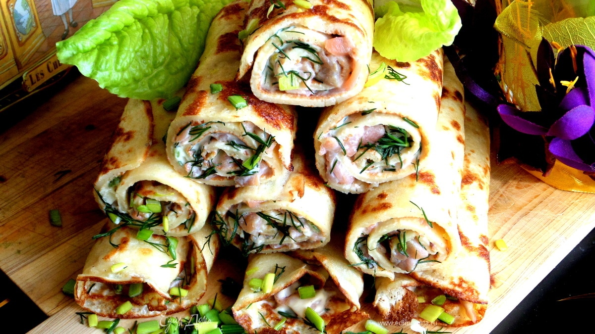 Очень было бы кстати на блинчик положить слой листа салата, а затем начинку. Так будет более хрустяще, я думаю. Спасибо за идею!