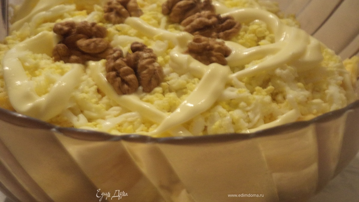 Теперь выкладываем оставшиеся три четверти крабовых палочек, смазать майонезом, немного присолить, выложить оставшуюся половину сыра, половину масла, оставшиеся яйца. Смазать майонезом, присолить. украсить половинками грецких орехов. Приятного Вам аппетита!!!