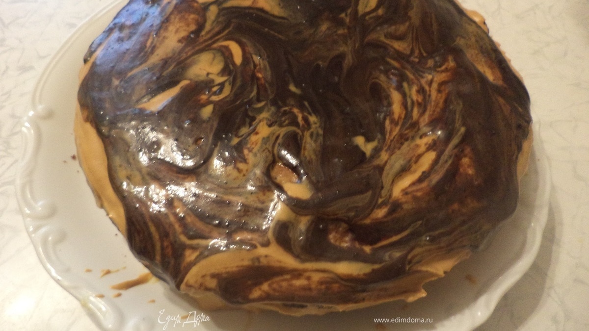 Глазурь остудить,нанести на поверхность торта, слегка перемешав глазурь с кремом, чтобы получился мраморный рисунок. Приятного аппетита!!!