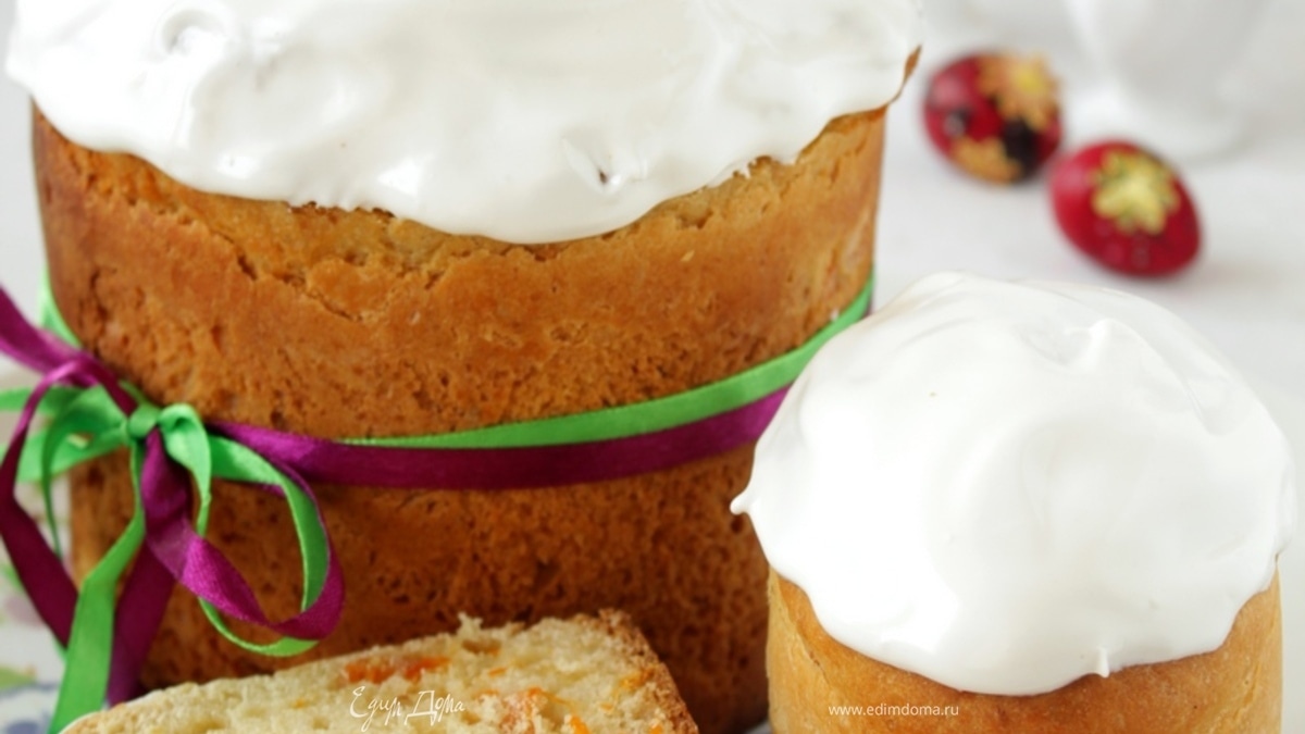 Для глазури: 1.Белок взбить с сахарной пудрой, добавить несколькими каплями лимонного сока. 2.Покрыть куличи глазурью и украсить по желанию. С праздником!