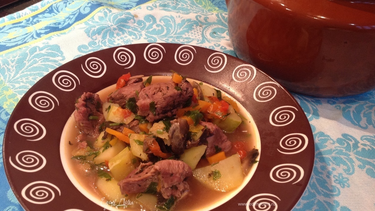 Говядина тушеная с овощами в горшочке