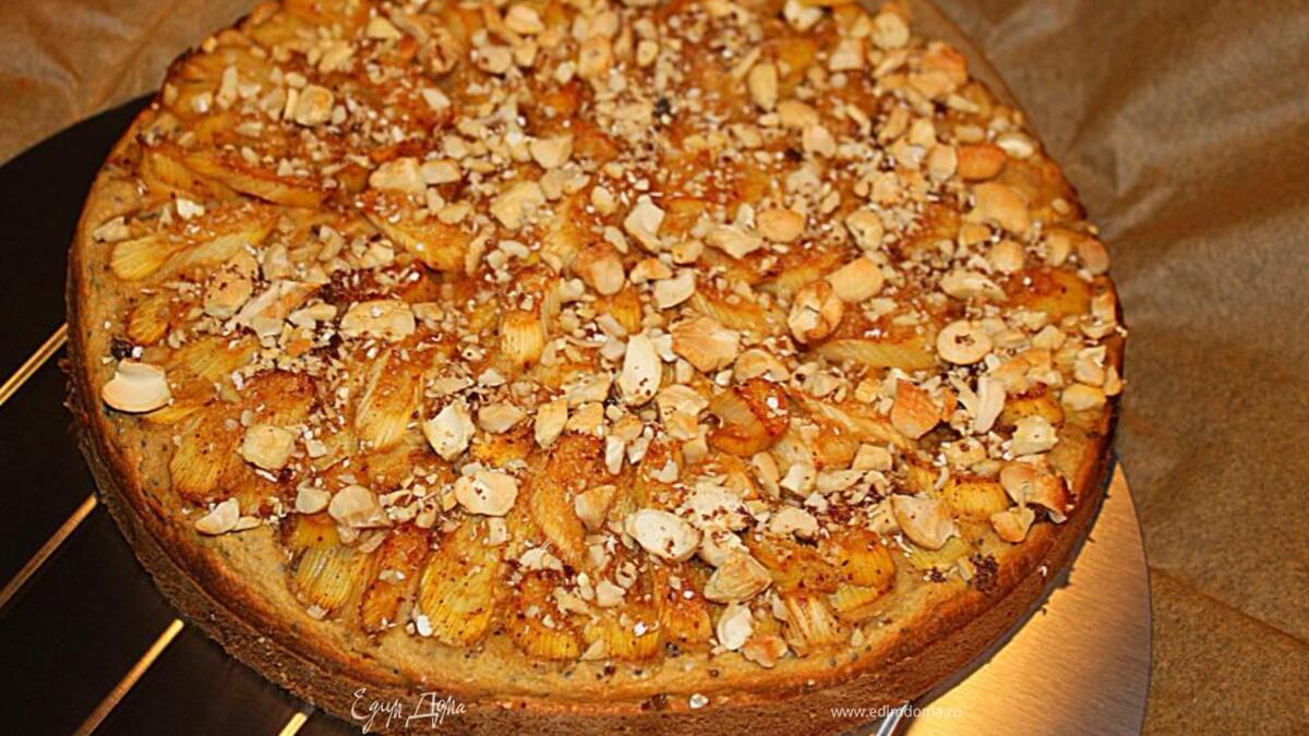 В разогретую духовку на 180 градосов ставим пирог на 25 минут. По истечению указанного времени достать пирог посыпать измельчённым кешью смешанным с 1 чайной ложкой сахара мускавадо. Продолжать печь в духовке ещё 10-15 минут. - Шаг 3
