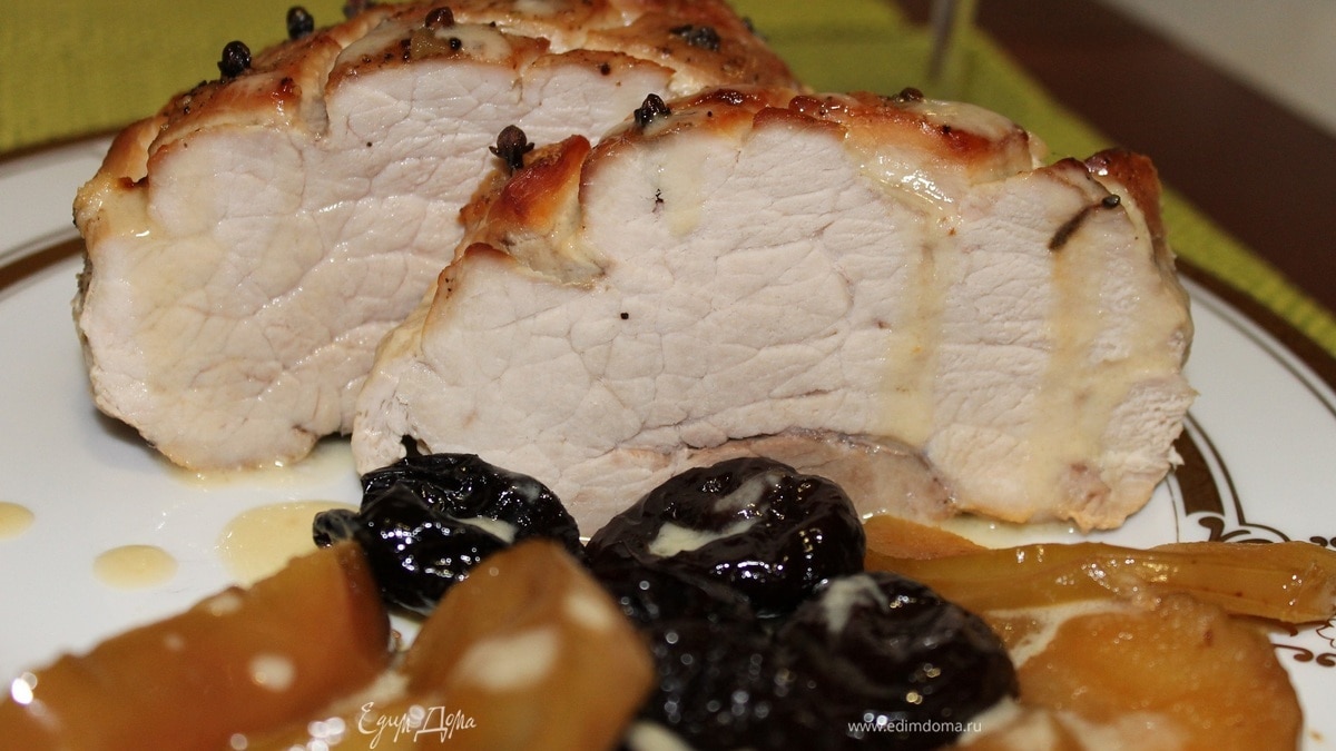 Вынимаем гвоздику, отрезаем ломтики мяса, выкладываем на тарелку, поливаем соусом и добавляем фрукты. Приятного аппетита!))